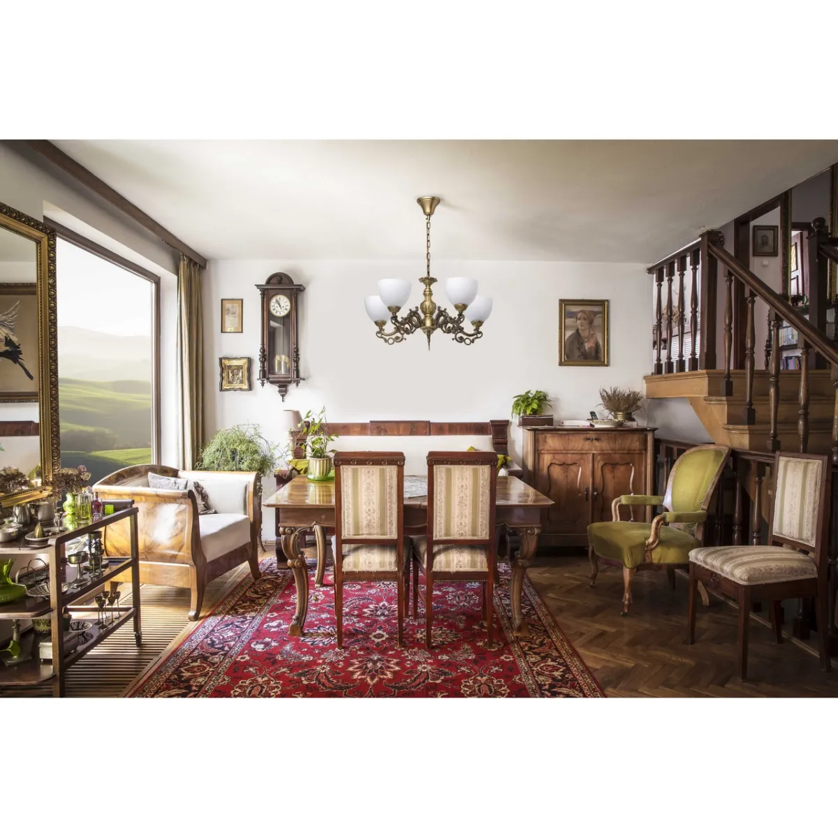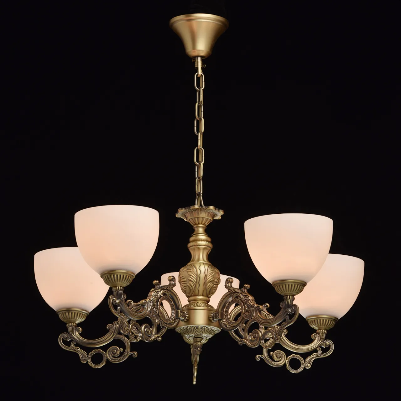 Металлическое основание цвета античной бронзы. Плафоны: матовое стекло.